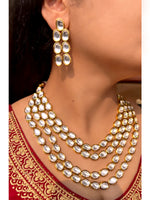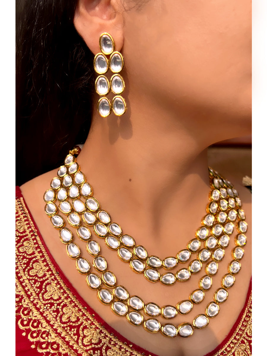 Gold plated 4 layered necklace set studded with simulated Polki diamonds.