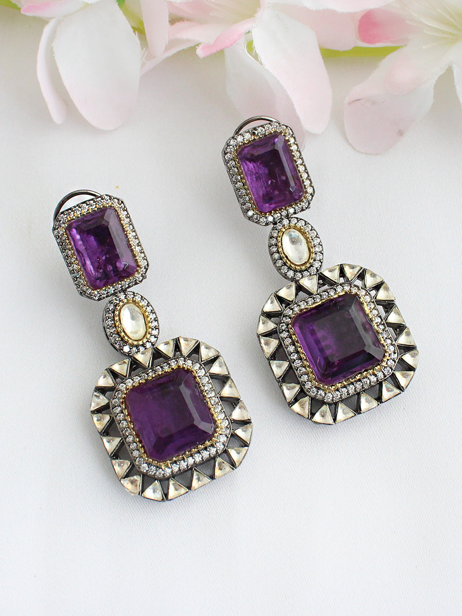 Presenting our Antique two tone earrings studded with simulated diamond CZs and Purple stone for a captivating and stylish look. Crafted on a base of high-grade alloy metal, This Two tone Earrings are versatile, making them suitable for various occasions such as weddings, festivals, and cultural celebrations. They effortlessly complement both traditional and contemporary outfits.