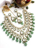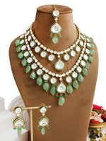 Introducing our Gold-Plated Layered Necklace Set, elegantly studded with simulated Polki Diamonds, CZs and Mint Green beads for a luxurious and elegant look.