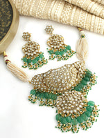 Discover the "Manika" choker set, a testament to the exquisite artistry of Jaipur. This stunning gold-plated choker, crafted in the heart of Rajasthan, features intricate kundan work and vibrant colored stones, culminating in a captivating dangling pendant. Delicate mint-colored beads sway gracefully, adding a touch of ethereal charm. Accompanied by lightweight earrings, this set is designed for comfort and elegance. The "Manika" boasts a pearl bunch detail and an adjustable cord for a perfect fit. Available in four captivating colorways, this choker set is a true masterpiece.