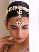 This headpiece is designed to enhance the bridal attire, combining the elegance of simulated polki diamonds with the timeless beauty of pearls. The gold plating adds a touch of richness, making it a perfect accessory for a wedding or any special occasion.