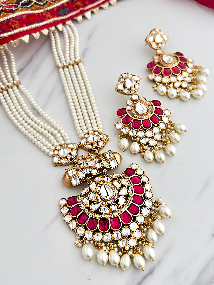 Matte gold finish long necklace set studded with simulated polki diamonds, CZs, ruby pink, green stones and faux pearls.