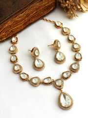 Introducing Our Gold-Tone Necklace Set is adorned with simulated Polki diamonds and sparkling CZs, creating a captivating look that blends tradition with elegance. Crafted from high-quality alloy metal, the necklace is paired with matching dangle earrings, making it perfect for weddings, festive occasions, or any moment that calls for timeless glamour.