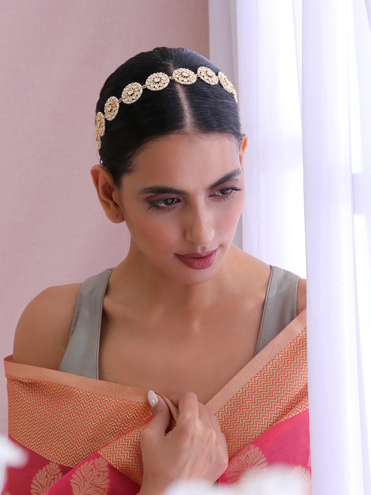 This headpiece is designed to enhance the bridal look with the timeless charm of simulated Polki diamonds and the elegance of faux pearl beads. The gold-plated finish adds a touch of sophistication, making it a perfect accessory for weddings and other special occasions. The length of 14 inches ensures that it beautifully frames the face, creating a stunning and regal appearance. Crafted from high-grade alloy metal, this headpiece promises durability and a polished finish.