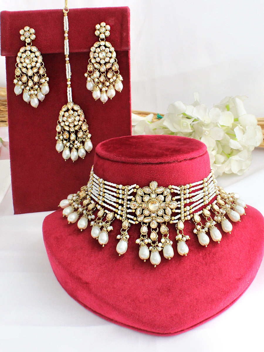 Introducing an Antique Gold Tone Choker Necklace Set, adorned with simulated Polkis, CZs and faux pearl beads for a graceful and timeless look.