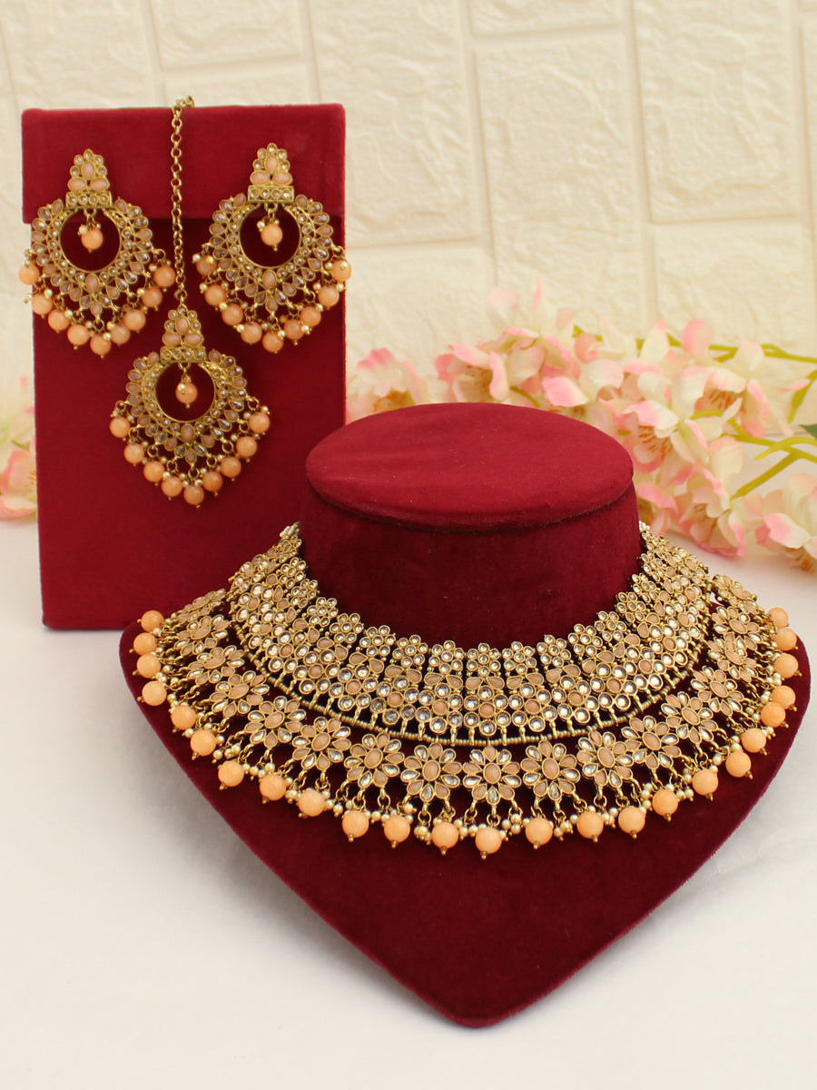 The Gold Tone Necklace Set Studded with Simulated Polki, Stones, and Beads is a stunning accessory set. Here are the details: