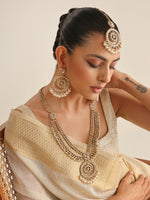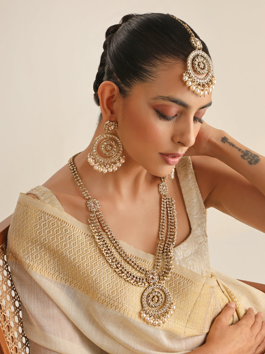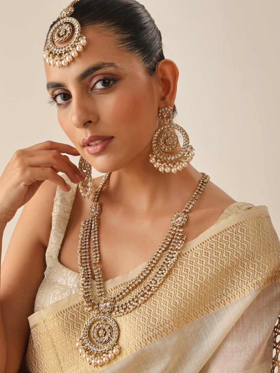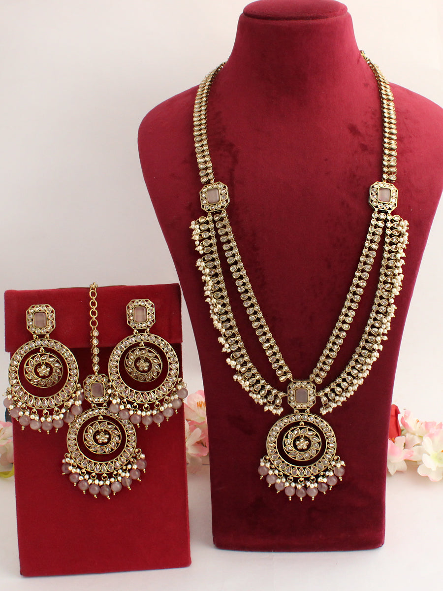 Gold tone long necklace Set studded with simulated polkis, multi color, faux pearls and beads.