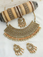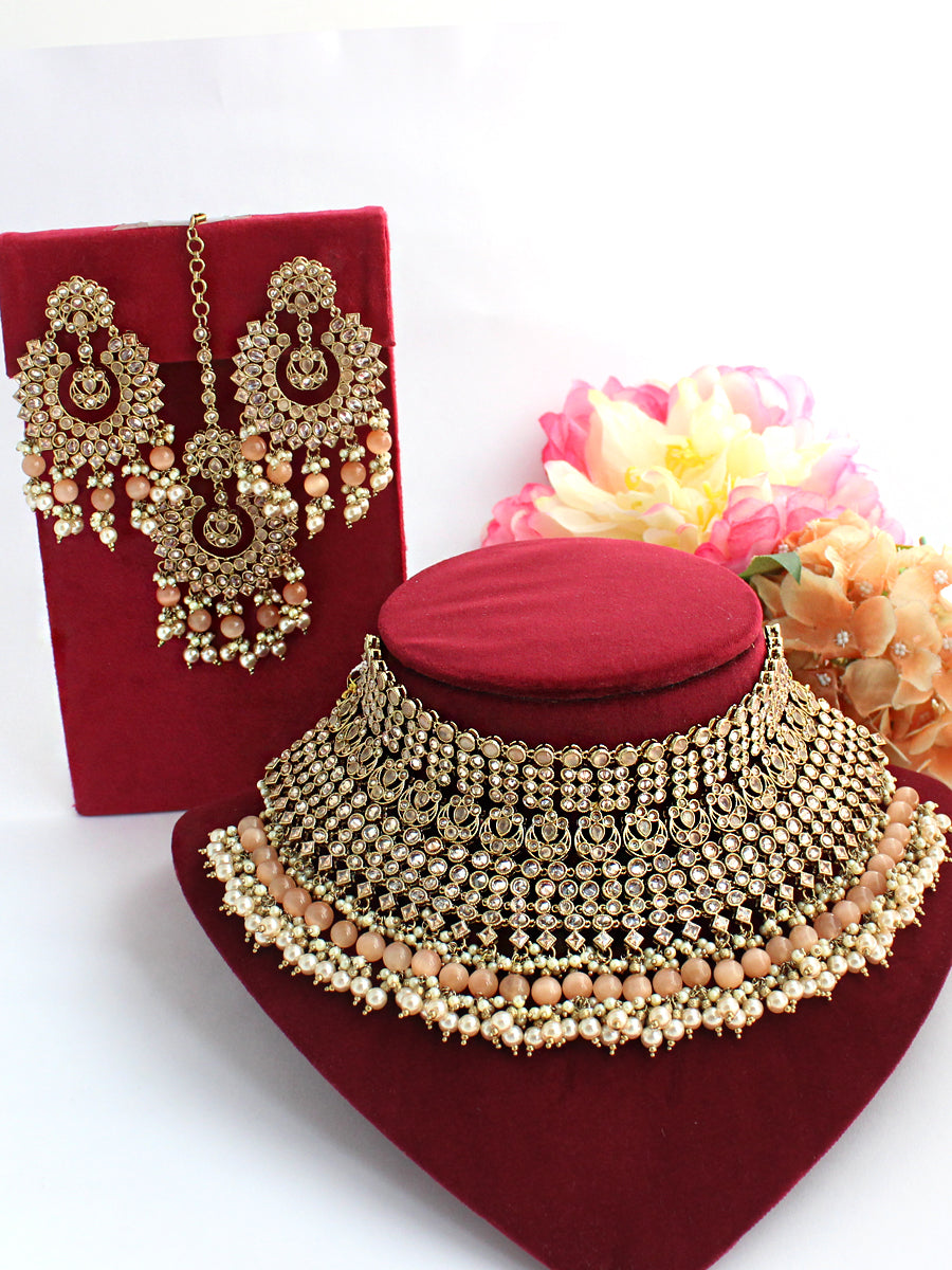 Introducing Our Gold Tone Necklace set studded with Simulated Polki and Peach Stones & Beads.