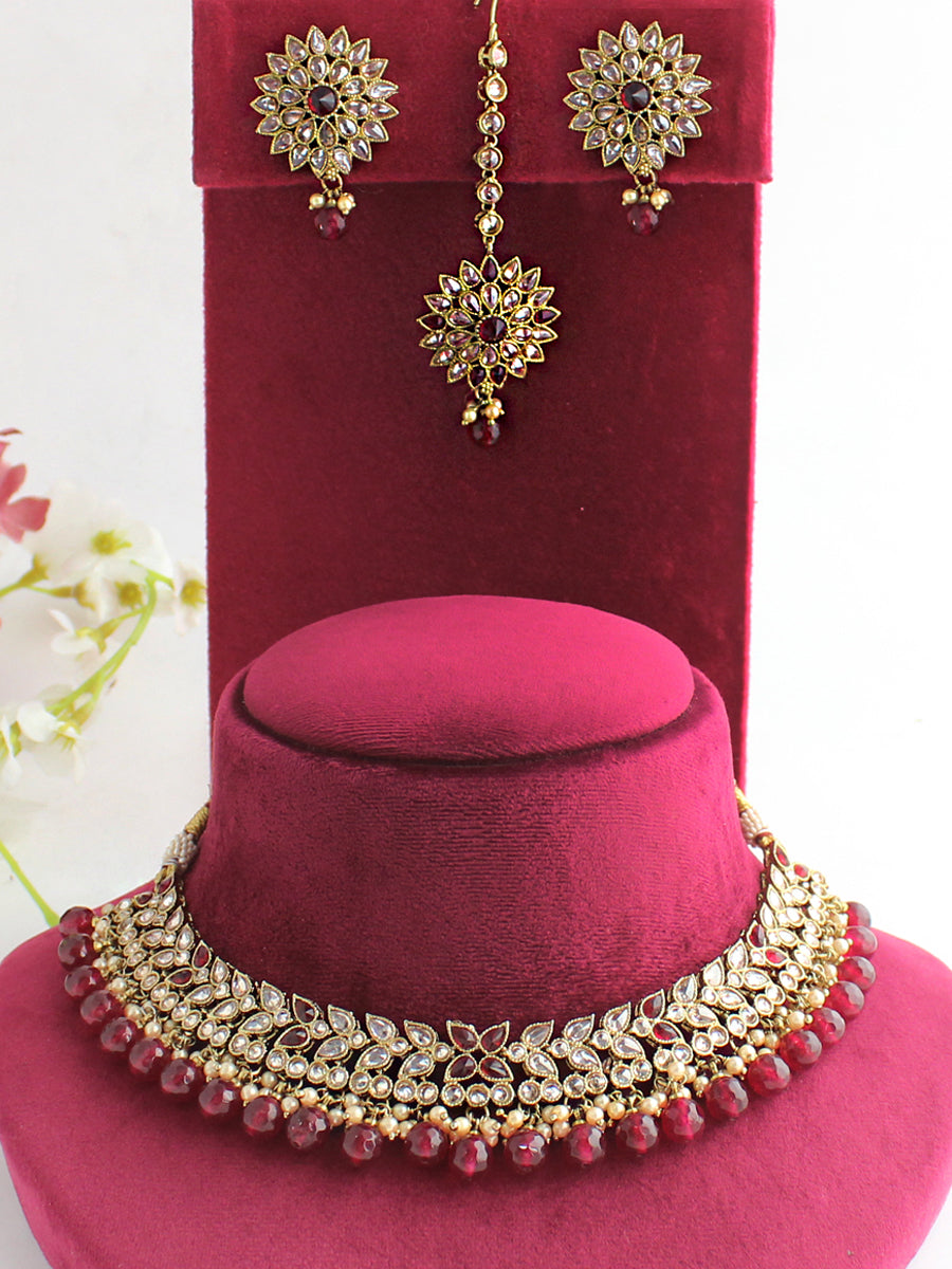 The gold tone necklace set is studded with simulated polki and maroon, green, yellow, peach, mint green, pastel pink, black, blue stones, and beads. The necklace measures approximately 8" in length with an adjustable cord fit to all neck sizes. The earrings measure approximately 45mm(L) x 30mm(W) or 1 3/4" (L) x 1 1/4" (W) with post back findings for pierced ears. The tikka measures approximately 4 1/2" in length with a width of 30mm or 1 1/4". The base is made of high-grade alloy metal.