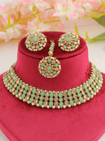 Gold Tone Necklace Set Studded with Simulated Polki, Green stones and Faux Pearls.