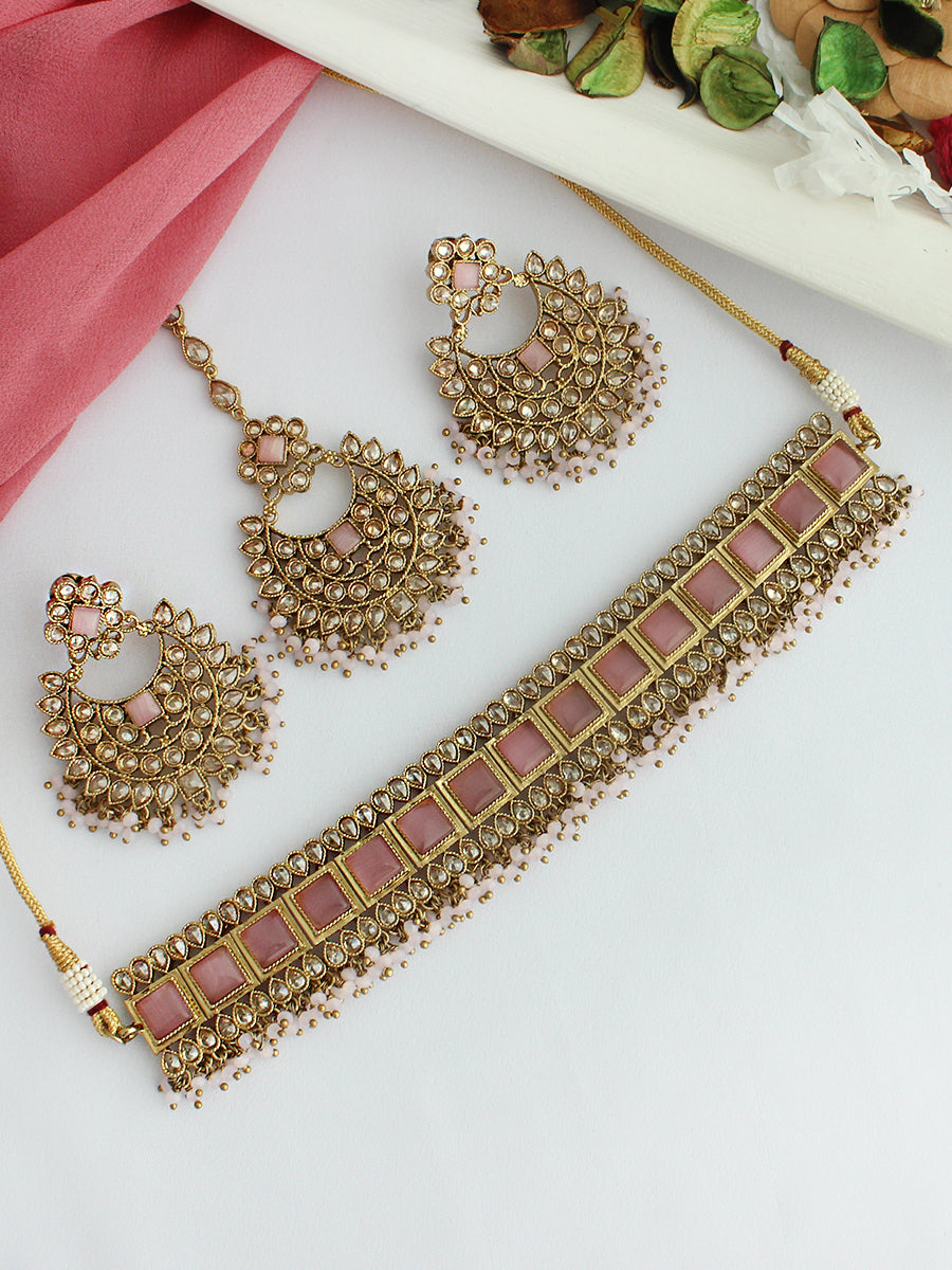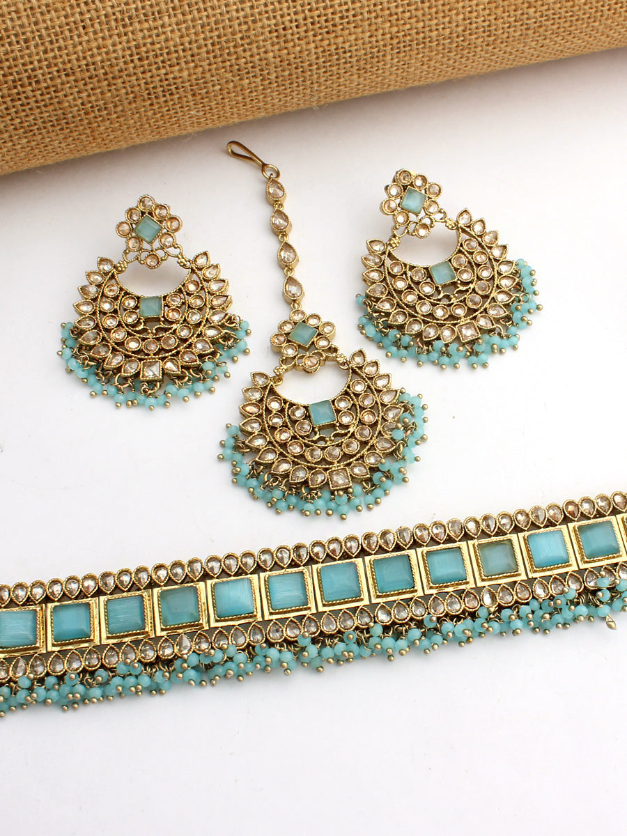 The Gold Tone Choker Necklace Set is adorned with Simulated Polki, Multi-Colored Stones, and Faux Pearls, creating a stunning and colorful design. Here are the specifications: