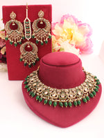 Gold Tone Necklace Set studded with Simulated Polki and Maroon, Green, Red, Yellow, Peach, Mint Green, Pastel Pink, Blue Stones and Faux Pearl Beads.