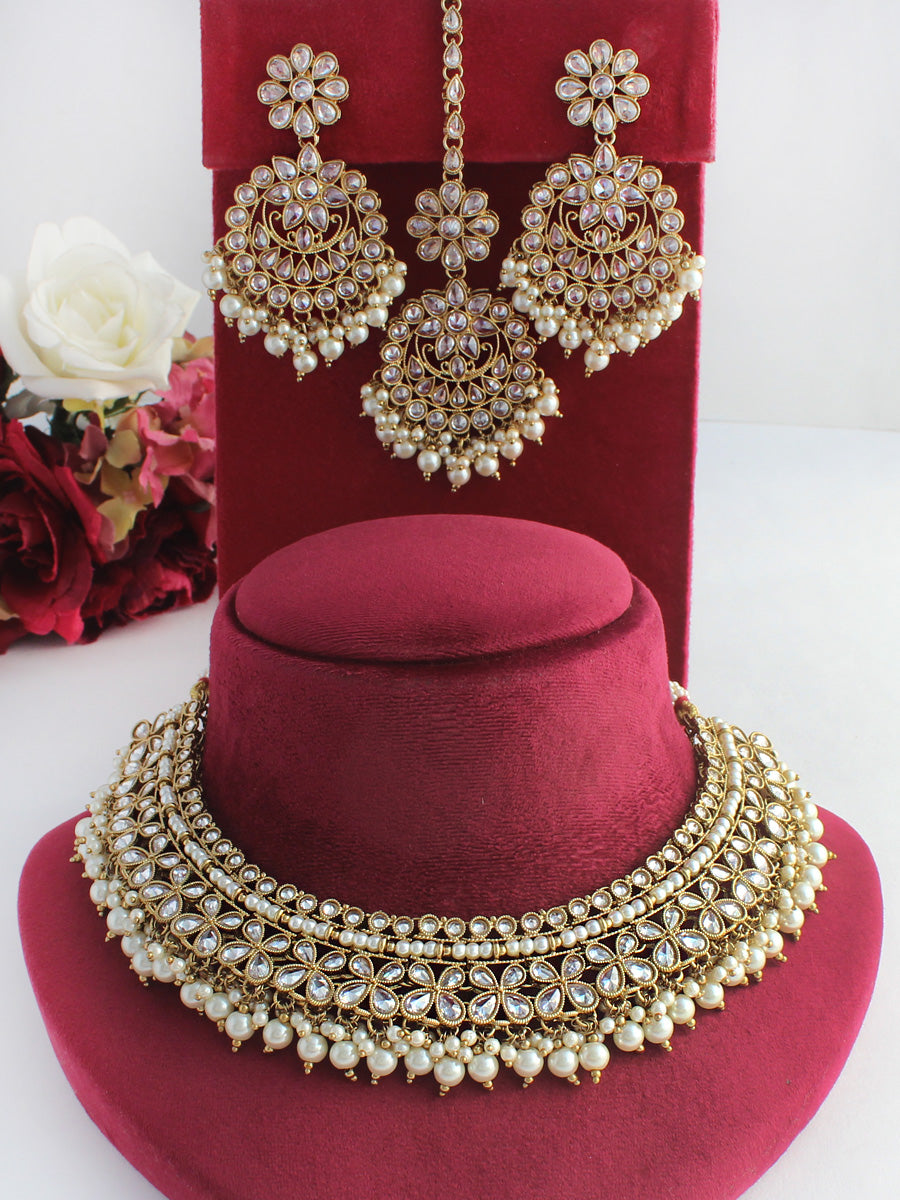 Silver/Gold Tone Bib Necklace Set studded with simulated polki and faux pearl beads.