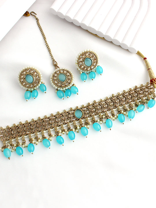 The Gold Tone Choker Necklace Set is a stunning piece studded with simulated polkis, faux pearls, maroon, green, hot pink, mint green stones, and beads. Here are the details: