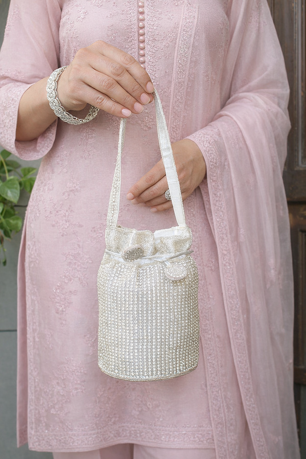 Introducing the Bucket Potli Bag, a stunning accessory adorned with intricate CZs and crystal beadwork, adding a touch of elegance and sparkle. This beautifully crafted potli bag features a handle and a drawstring closure, ensuring both security and style. Perfect for any special occasion, this potli seamlessly blends traditional charm with a modern twist, making it a must-have addition to your wardrobe.