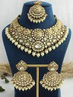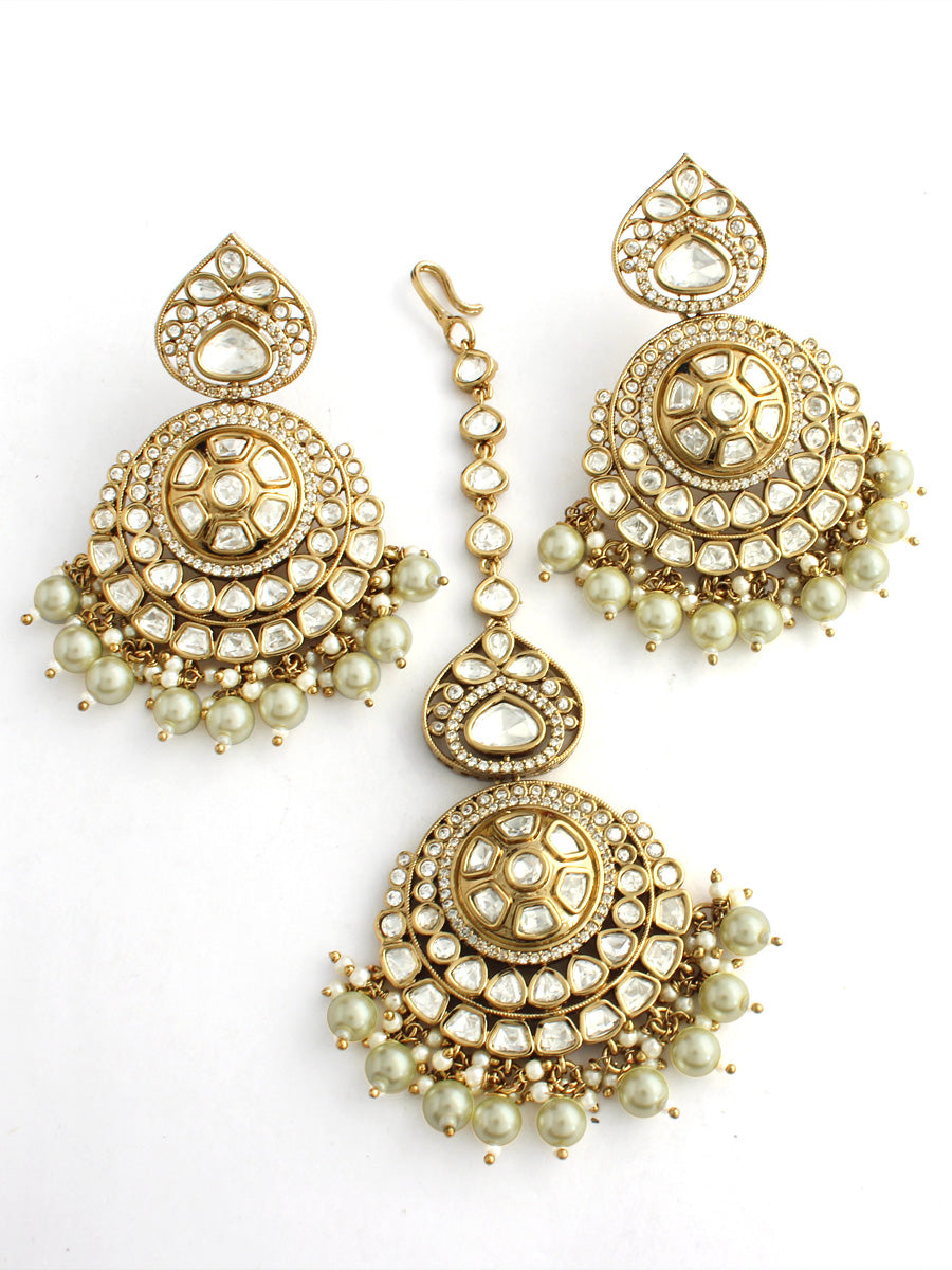 Introducing Antique Gold Necklace Set, adorned with simulated polki diamond, CZs and faux pearl beads for a majestic and opulent look.