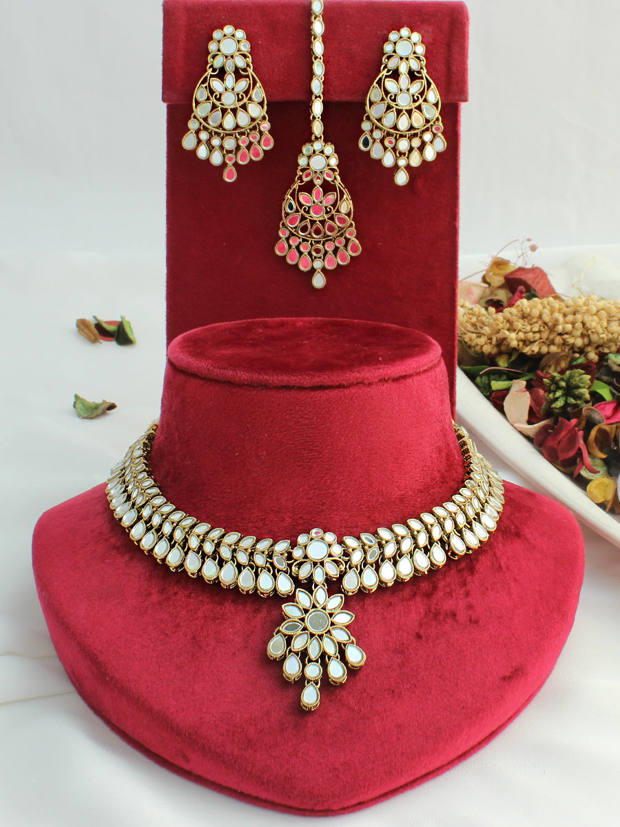 Introducing our gold tone mirror bib necklace set adorned with faux Pearls, mirrors for a attractive & graceful look. .