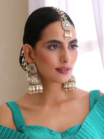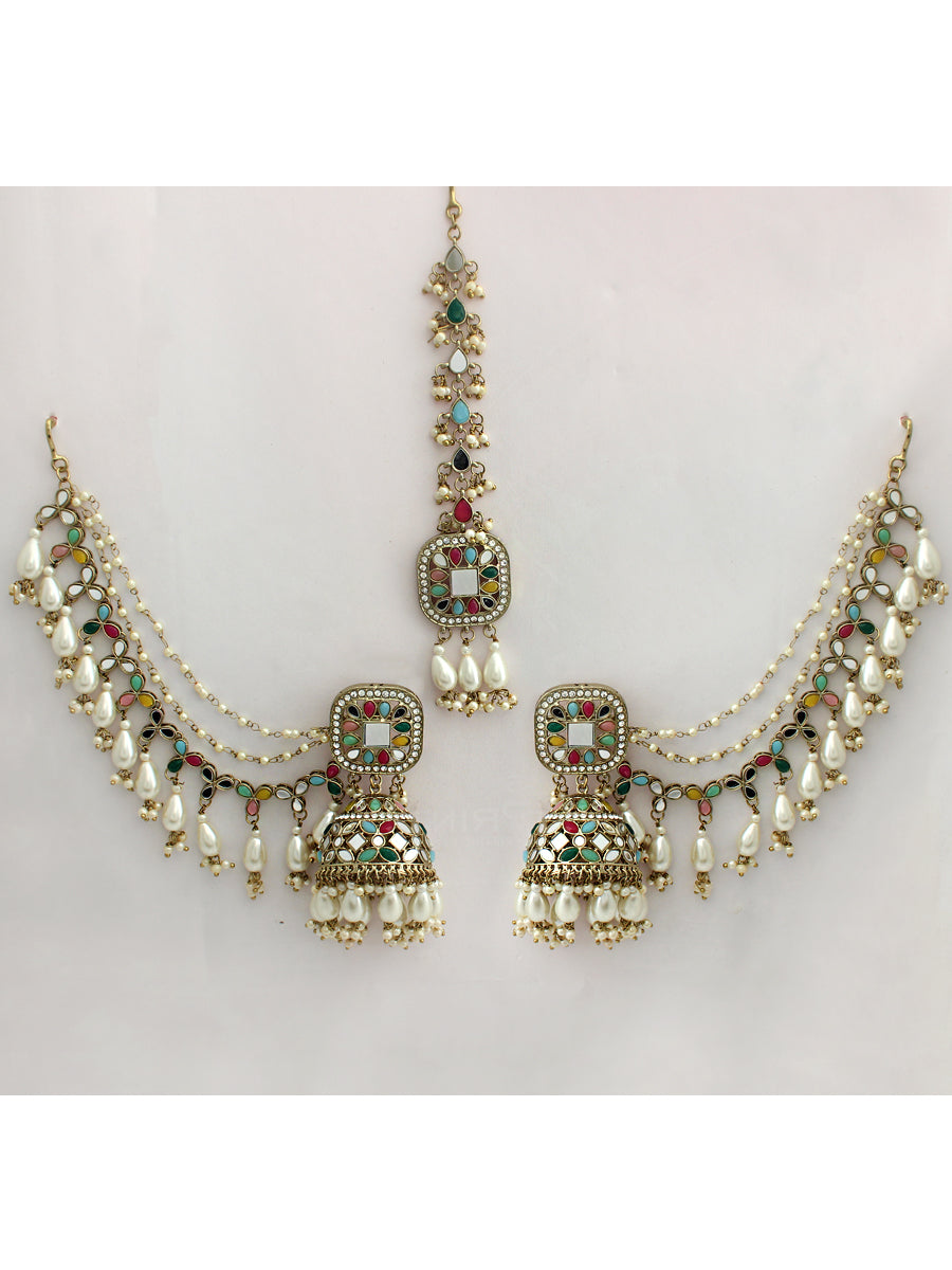 Antique Gold Tone Jhumki Earrings and Tikka studded with mirrors and colored beads. The details of the set are as follows: