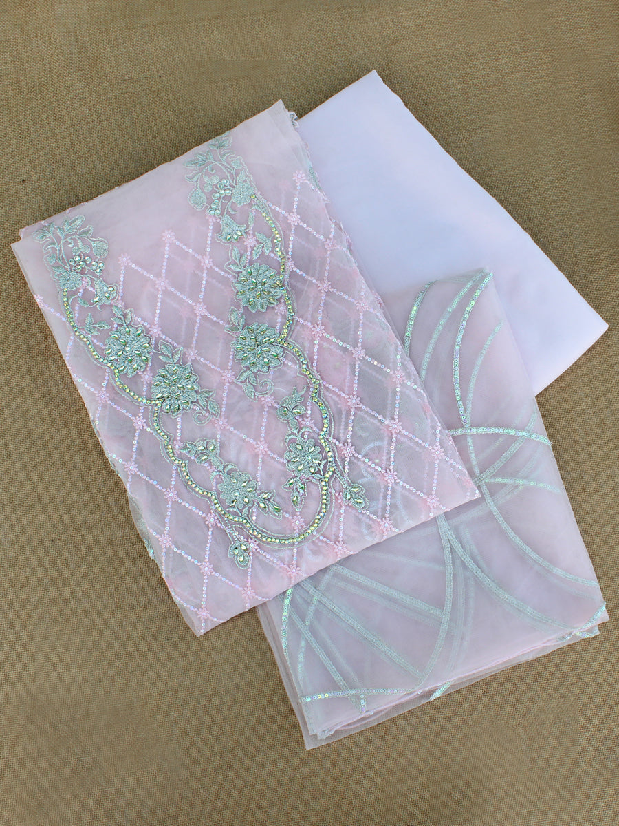 Pastel Pink Embroidered Unstitched Pakistani Suit Features A Net Kameez with Santoon Inner & Bottom and Embroidered Net Dupatta.