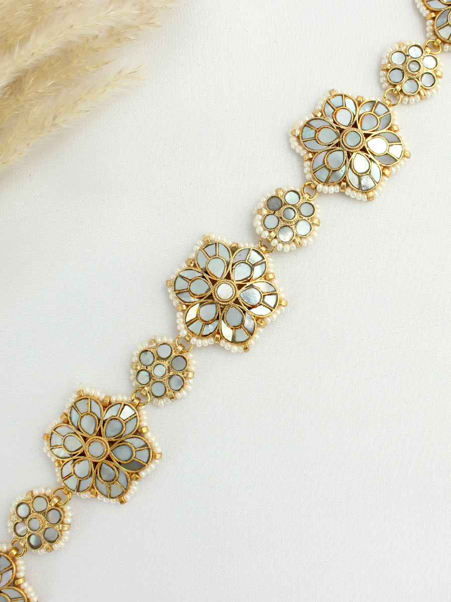 Introducing our Sheeshphool Mathapatti Headpiece, a stunning accessory crafted with elegance and charm. This gold-plated mathapatti features natural mother of pearls, adding a sophisticated touch to any look.