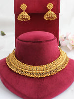 Introducing our South India Style Bib Necklace Set, exquisitely designed to showcase traditional craftsmanship and timeless beauty. This stunning set features a bold bib-style necklace, intricately adorned with shimmering golden beads and detailed engravings that highlight the rich heritage of South Indian jewelry. Complementing the necklace are matching jhumka earrings, crafted with the same attention to detail and finished with delicate dangling beads, adding graceful movement and charm. Made from durable high-quality alloy metal with a luxurious antique gold finish, this set is lightweight yet eye-catching, perfect for weddings, festivals, and special occasions where you want to make a lasting impression. Celebrate tradition with style and elevate your ethnic wardrobe with this captivating jewelry set that blends classic elegance with modern wearability.
