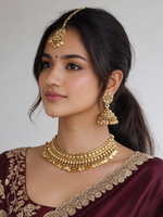 Introducing our Gold-Tone South Indian Style Bib Necklace Set, beautifully adorned with elegant shell-shaped accents for a vibrant, traditional touch. Crafted on a base of high-grade alloy metal, this set blends timeless cultural aesthetics with contemporary charm. It comes complete with matching jhumki earrings and a tikka, making it a perfect choice for festive occasions, weddings, and traditional celebrations.
