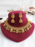 Our Gold Tone South Indian Style Necklace adorned with Simulated Hot Pink & Green Stones and Golden beads for a regal and traditional touch. The matching jhumki earrings complete the ensemble, creating a sophisticated and elegant look. The adjustable cord on the necklace ensures a comfortable and customized fit for any neck size. Adorn yourself with the regality of our intricately designed necklaces, each pendant a miniature masterpiece mirroring the divine tales.