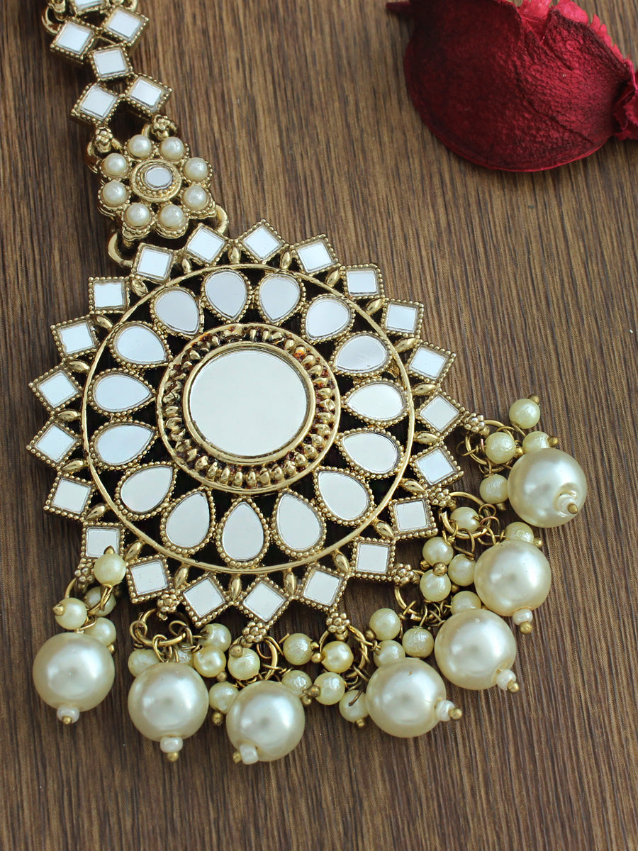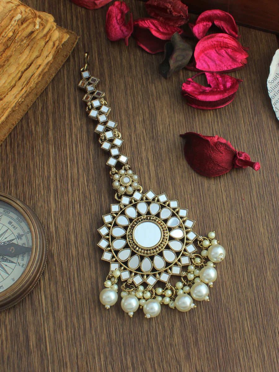 Antique gold tone maang tikka studded with mirrors and faux pearl beds.