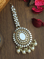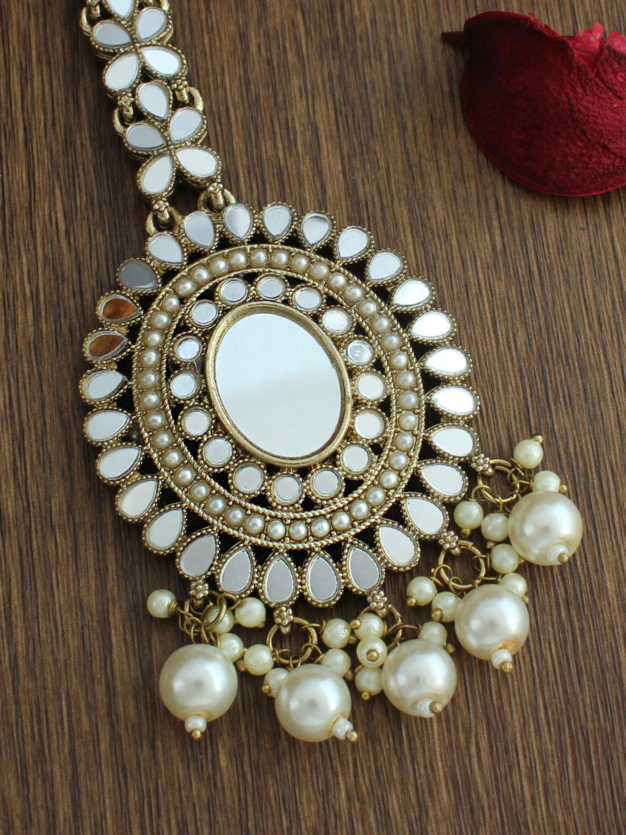 Antique gold tone maang tikka studded with mirrors and faux pearl beds.