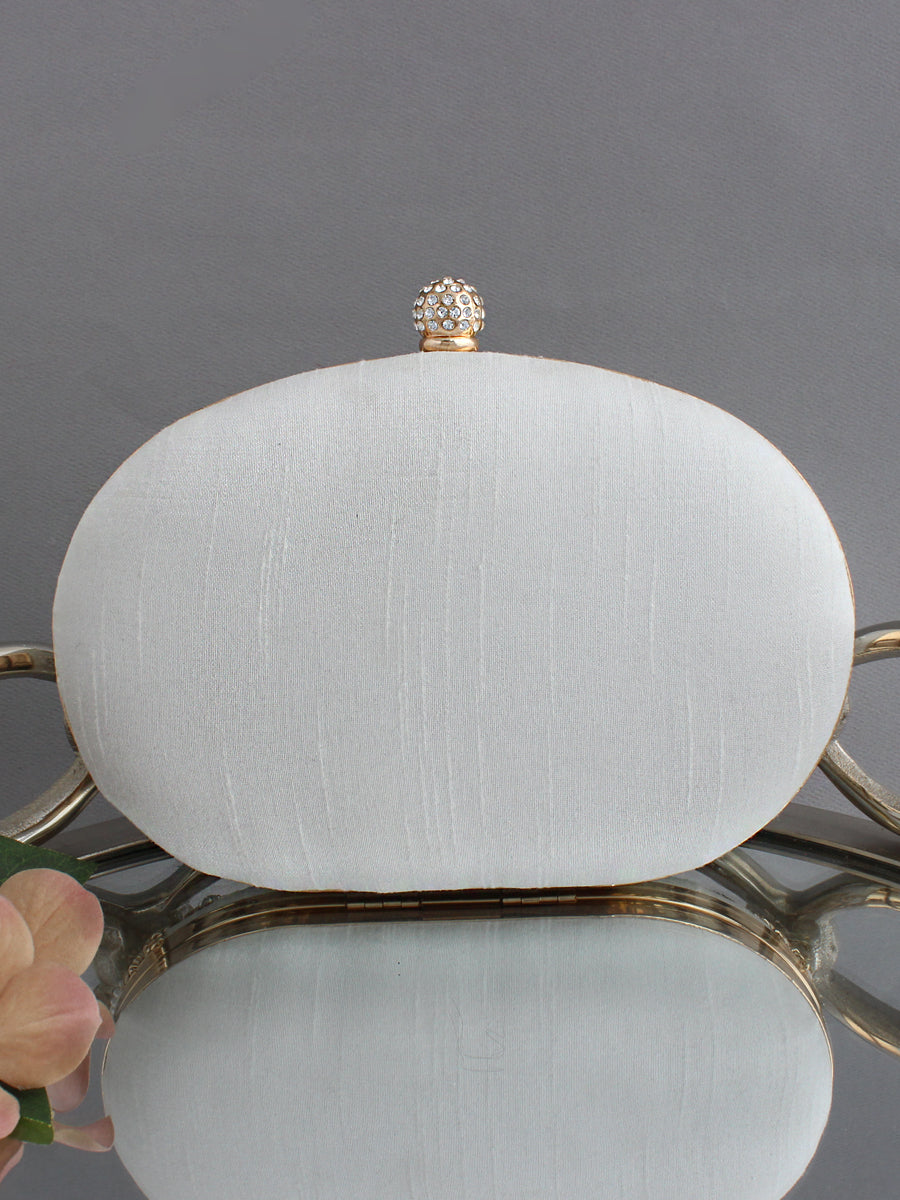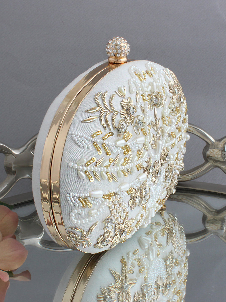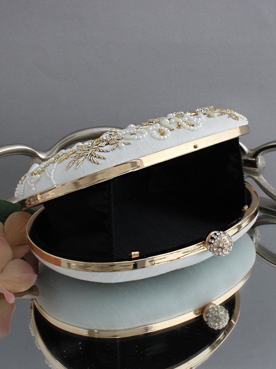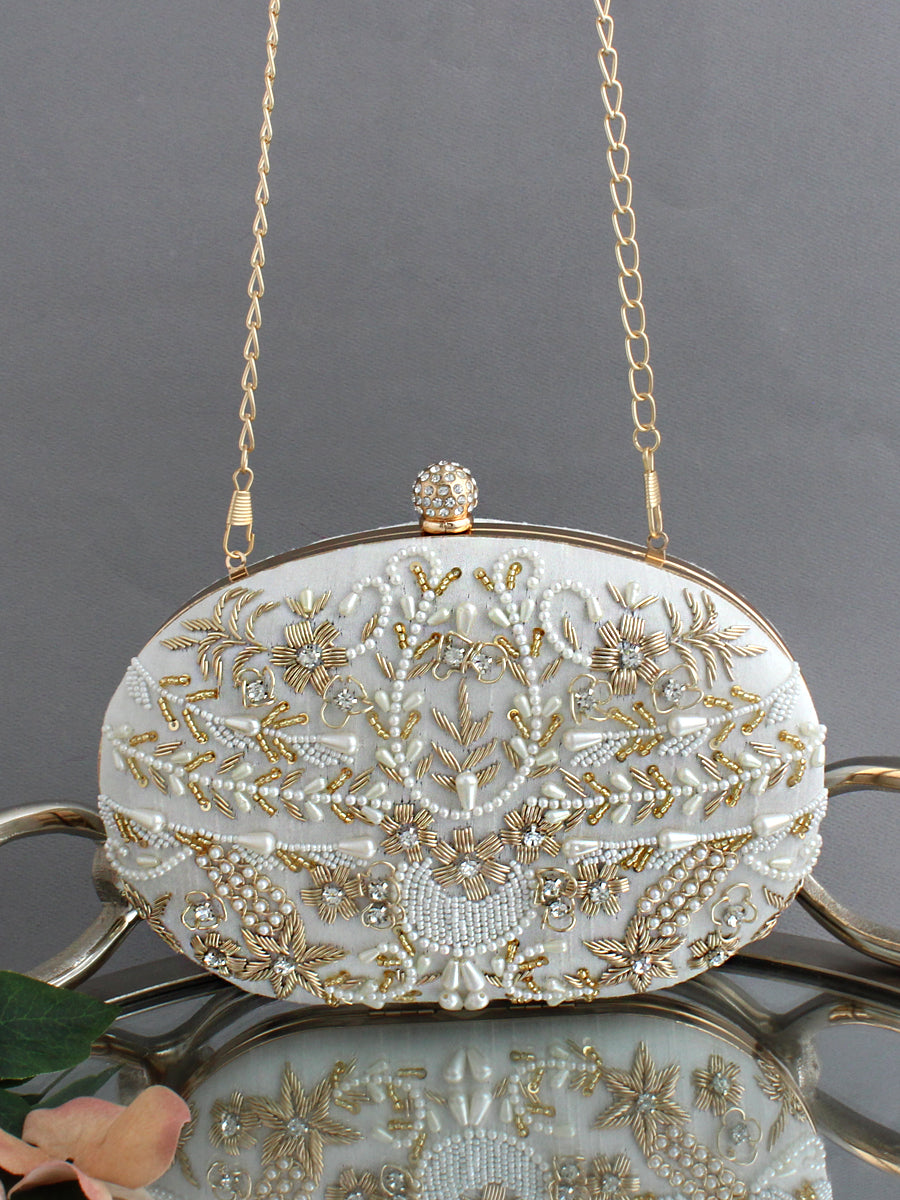 This oval shape clutch bag box adorned with CZs, Pearls and golden zardozi hand embroidery, it has a metal frame with a metallic clasp lock. It features an optional golden chain shoulder strap. This bag can fit a smartphone, makeup, keys, currency and cards.