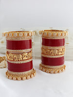 This set combines the traditional essence of bridal chuda with the elegance of faux pearls and CZs .The inclusion of Barat bangle adds a unique charm in the set. Crafted from a combination of high-grade alloy metal and acrylic, this set is designed to enhance the beauty of the bride on her wedding day.