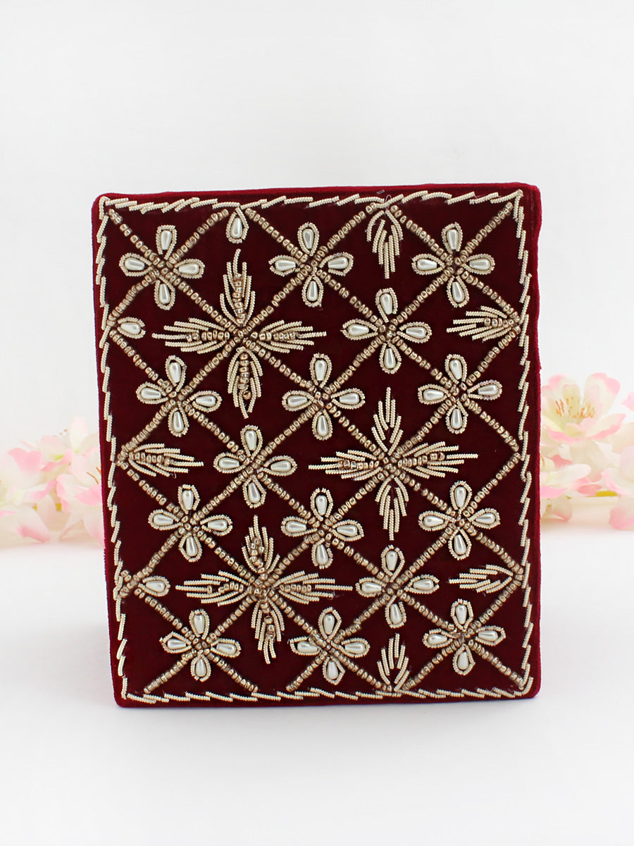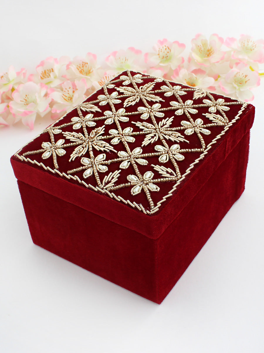 This Velvet Kaleera Box is adorned with Pearls, Golden Beads and Dabka Salma Work You can have your Name, Special Date or #Hashtag written (Max 8 Alphabets) on the side of the box. 25 days are required to do the customization.
