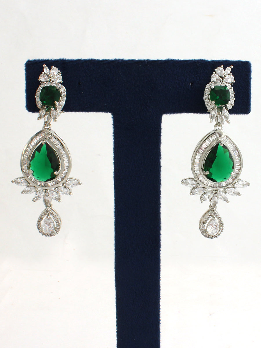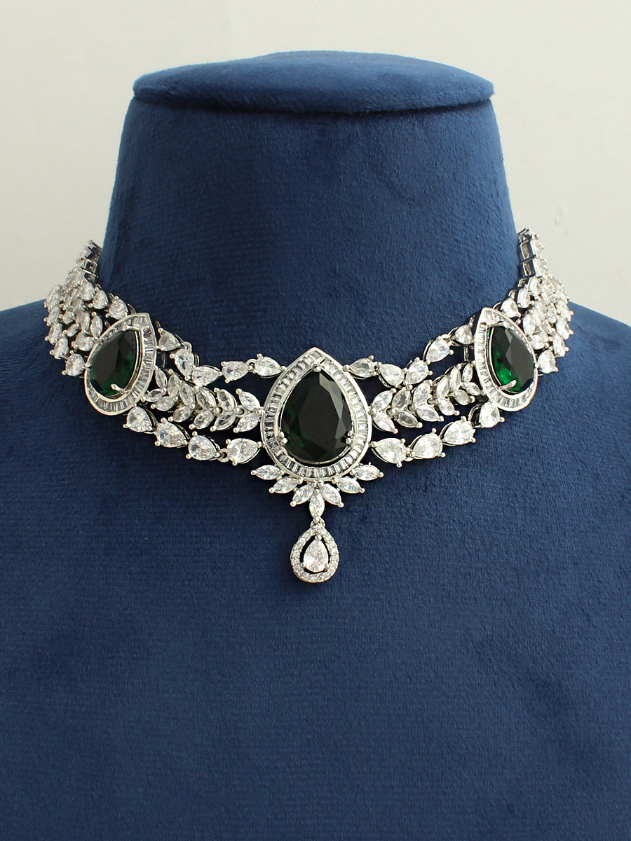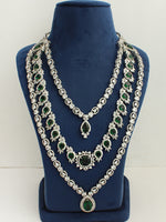 Silver tone layered Necklace set studded with simulated diamond CZs and emerald green stones..