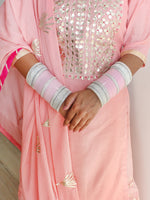 A set of 74 silver tone pastel pink bridal chuda/choora/chooda bangles studded with CZs and faux pearls. The details of the bangle set are as follows: