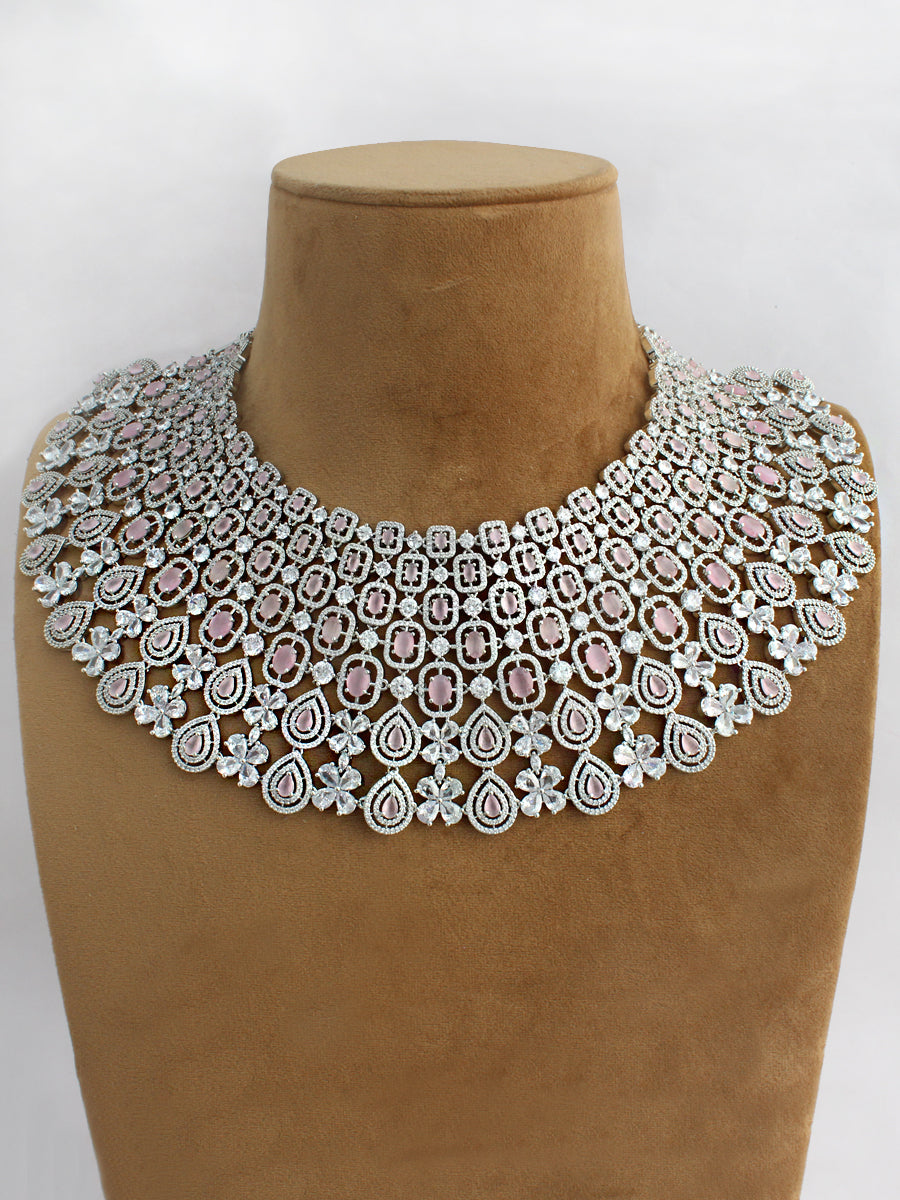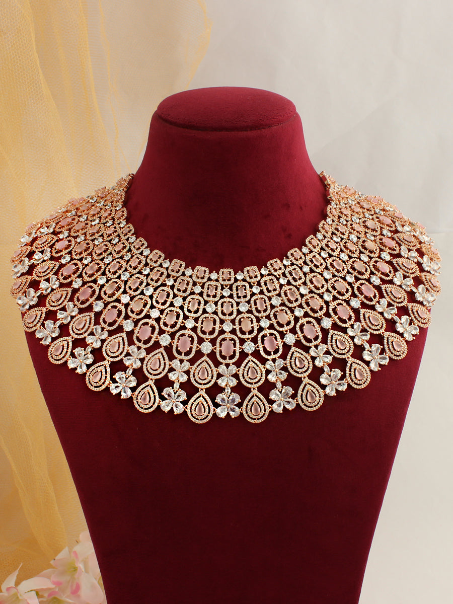 Rose Gold / silver finish bib necklace set studded with simulated diamond Czs, Polkis, mint green and pastel pink stones. NOTE : Bangles Sold Separately