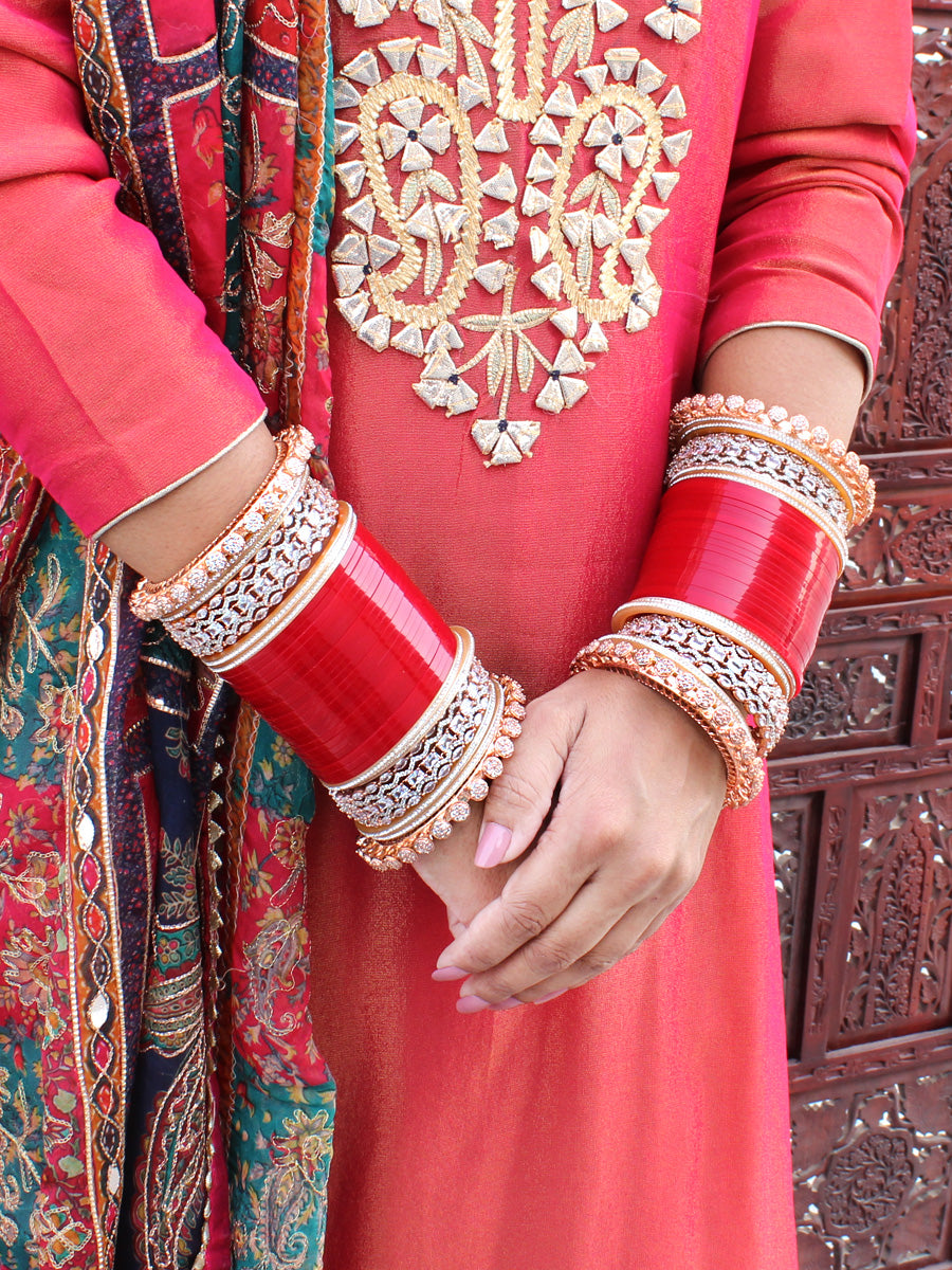 A set of 72 rose gold finish maroon bridal chuda/choora/chooda bangles studded with simulated polkis and CZs. The details of the bangle set are as follows: