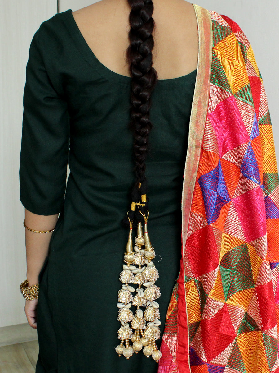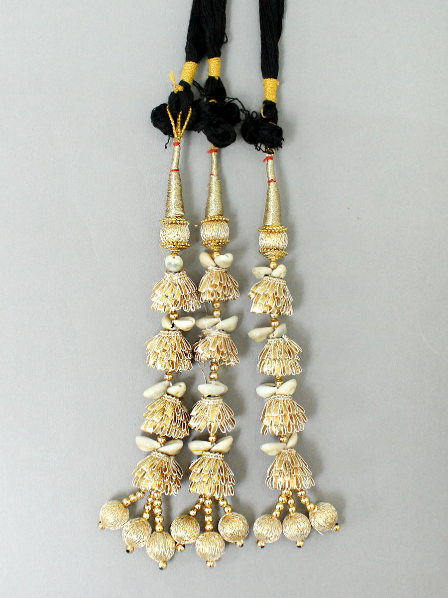 - Punjabi traditional paranda / parandi braid decoration choti hair accessory adorned with gota, sea shells (kodi ) golden beads and tassels