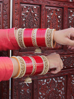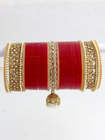A set of 74 maroon bridal chuda/choora/chooda bangles studded with CZs, faux pearls, and simulated polkis. The details of the bangle set are as follows: