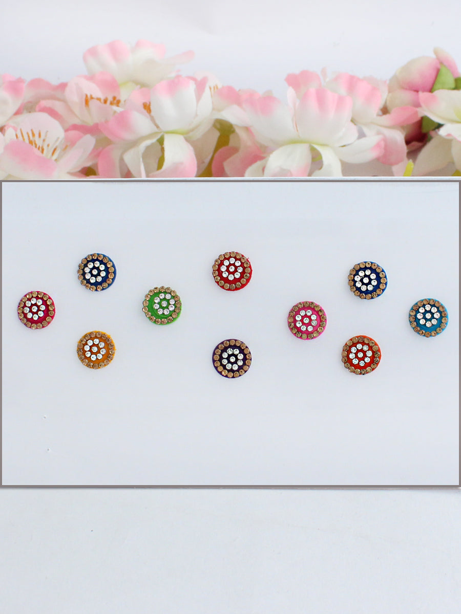 Round-shaped Bindi with Golden & White Stones (CZs) Bindi Size: 12mm Quantity: 10 NOS Material: Velvet