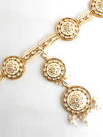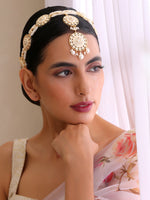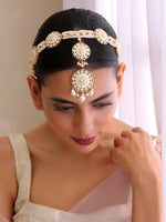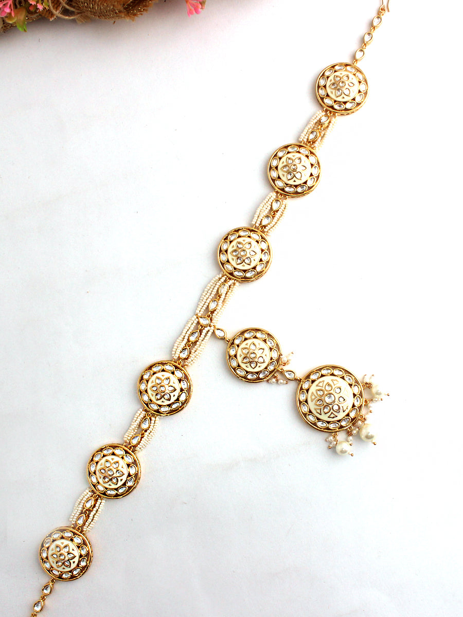 This headpiece combines the classic appeal of simulated polki diamonds and pearls with the artistic touch of Meena (Enamel) work, creating a piece that is both traditional and stylish. The gold plating adds a luxurious element, making it an ideal choice for a bridal ensemble.