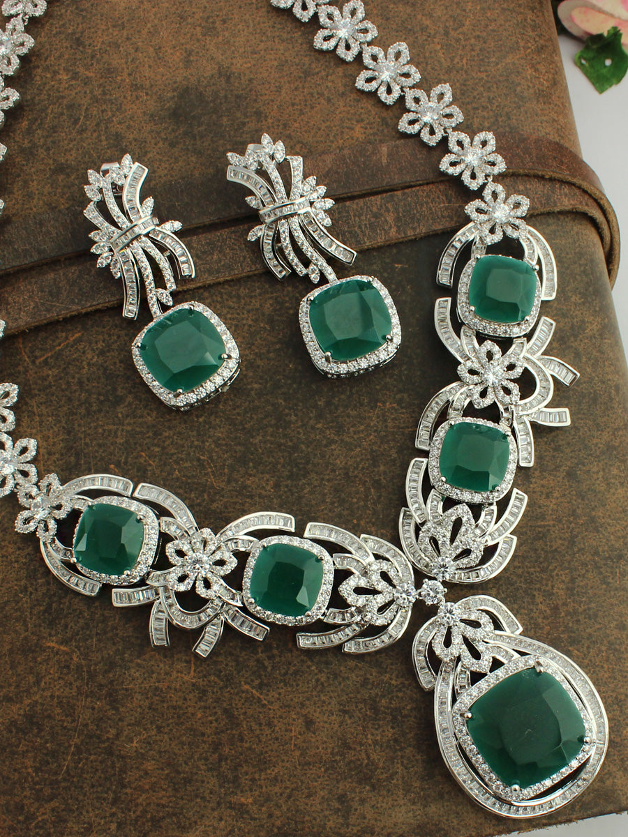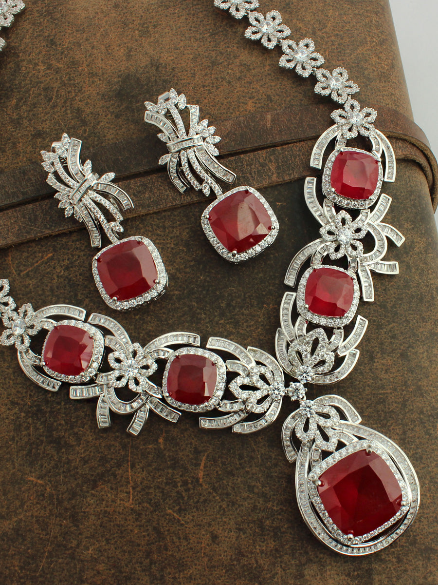 This silver tone necklace set combines the brilliance of simulated diamond CZs with the richness of maroon & green stones. The adjustable chain ensures a comfortable and customized fit, making it a versatile accessory for various occasions.
