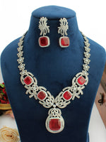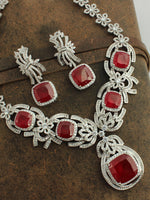 The Silver Tone Bib Necklace Set adorned with simulated Diamond CZs, Maroon and Green Stones for an opulent look.