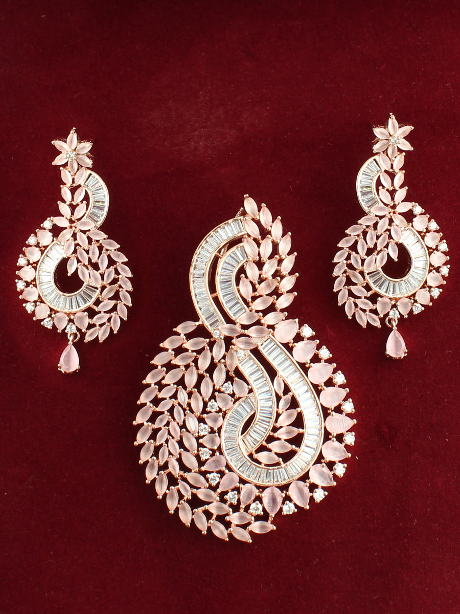 Silver / rose gold finish pendant set studded with diamond CZs, pastel pink, green stones and baguette cut stones.