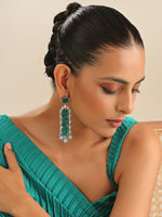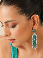 Antique silver tone dangle long earrings studded with simulated diamond CZs and shattered green stones.