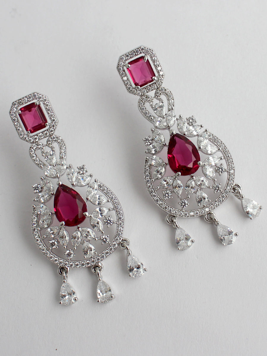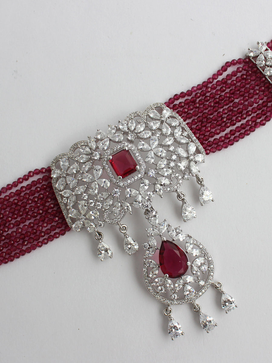 Silver Tone Choker Necklace Set Studded with Simulated Diamond CZs and Ruby pink stones & Crystal Beads.