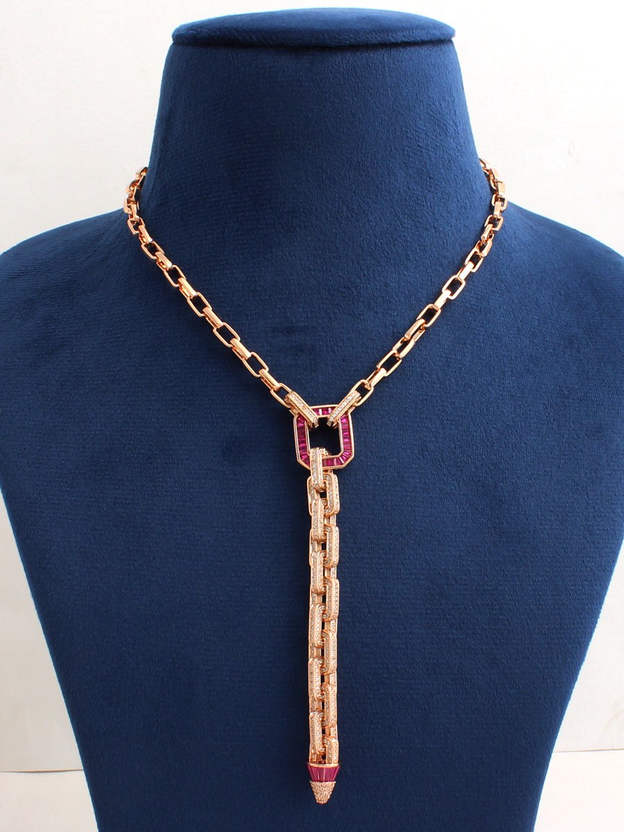Note: This rose gold finish necklace, adorned with simulated diamond CZs and ruby pink stones, is a striking piece that seamlessly blends modern and classic elements. The latch lock ensures a secure fit, making it a versatile accessory for various occasions. Ideal for those who appreciate the beauty of rose gold and the sparkle of simulated diamonds.