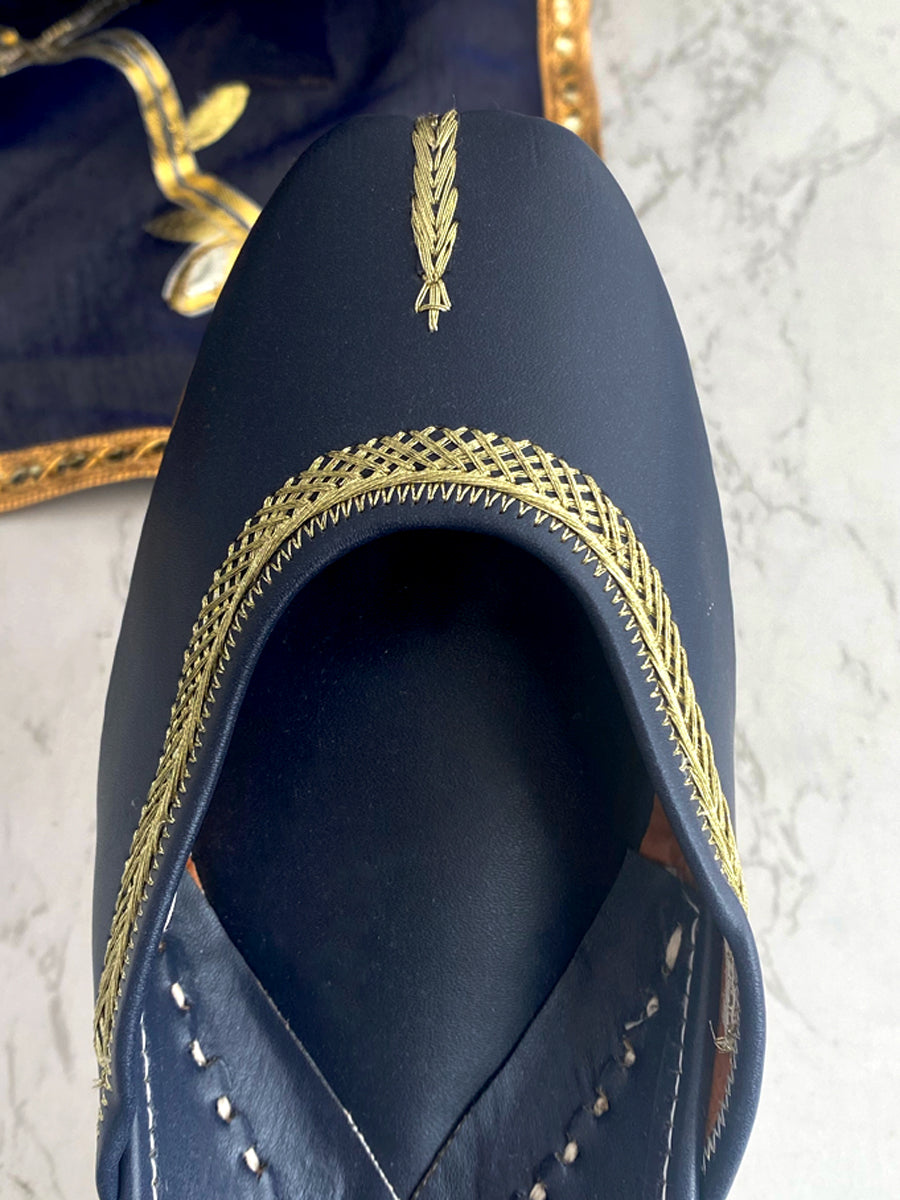 The Happiness Collection, featuring the Baarish Jutti, is a celebration of the small joys that bring happiness. Handcrafted by local craftsmen in Punjab, these Juttis showcase the rich craftsmanship of the region. The Baarish Jutti, specifically, is a Navy Blue piece adorned with Matte Gold Embroidery, creating an elegant and stylish design. The use of soft leather ensures maximum comfort, making these Juttis a perfect combination of fashion and ease for any occasion.