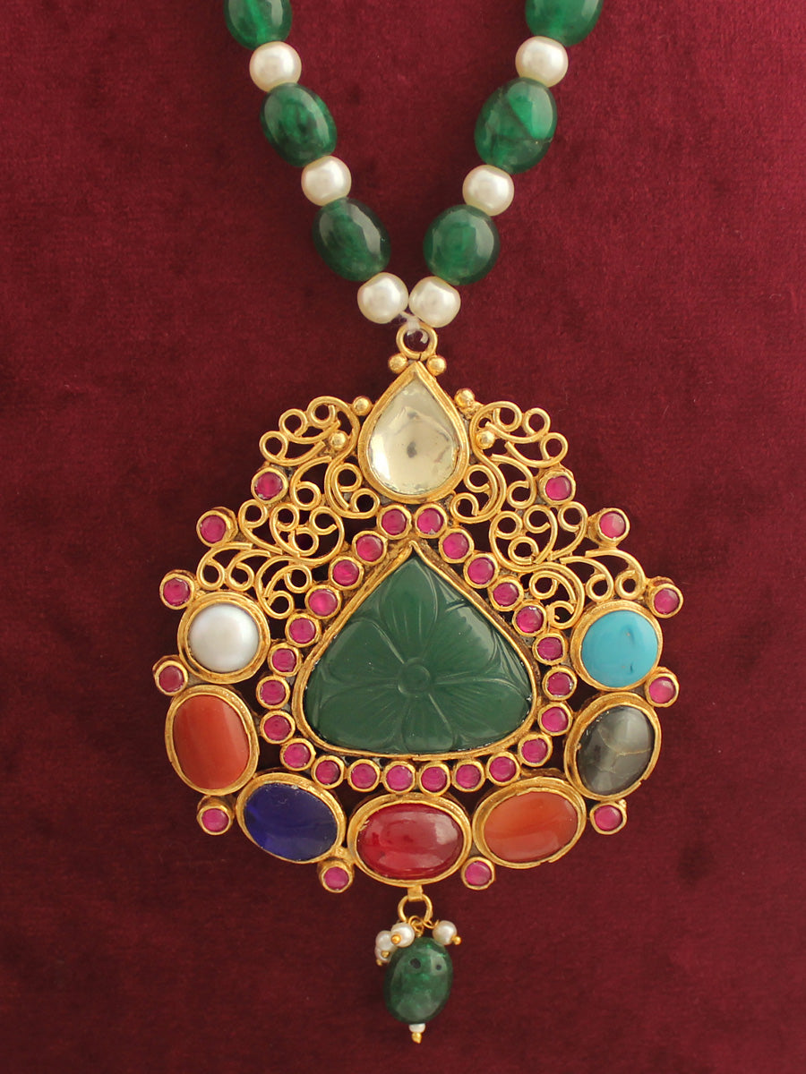 Gold plated long necklace set studded with simulated kundans, multi color stones, faux pearls, green carved stones and beads.