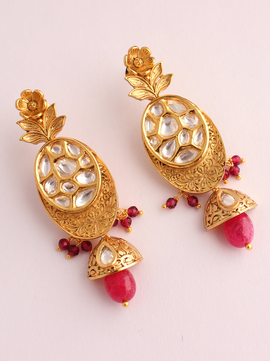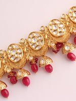 Gold Plated Choker Necklace Set Studded with Simulated Diamond Polki Faux Pearl Ruby Beads.