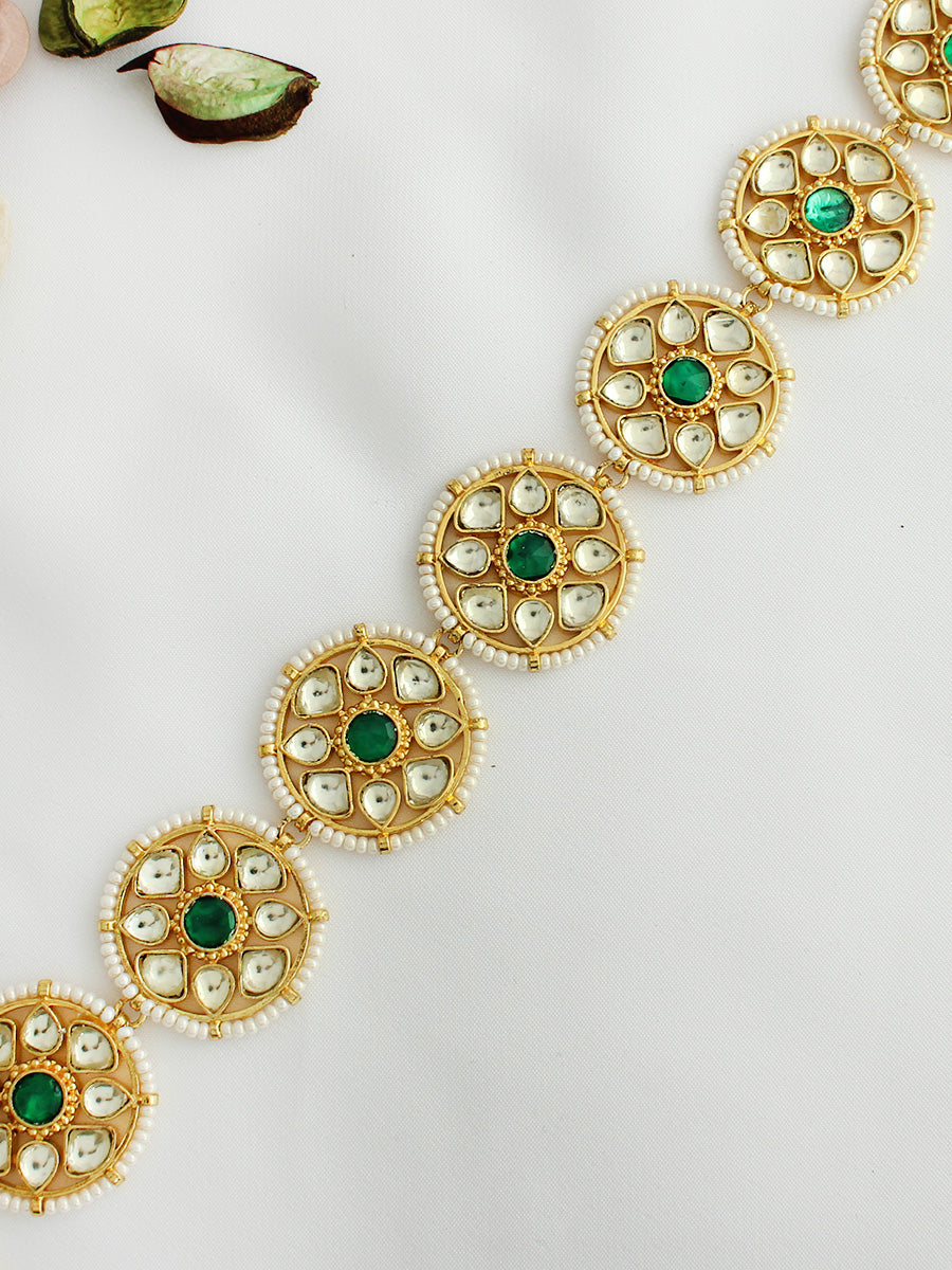 • Gold Plated Sheeshphool Mathapatti Studded with Simulated Kundan Pink Stones and Pearl Beads.